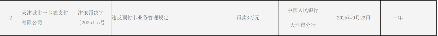 中國人民銀行天津市分行也於10月9日公佈一條處罰決定信息,其中顯示,天津城市一卡通支付有限公司同樣因違反預付卡業務管理規定被罰款3萬元。