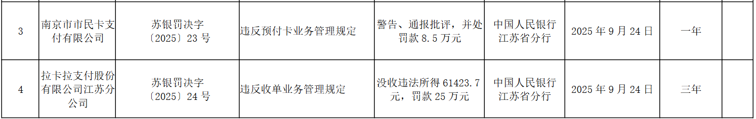 其中,拉卡拉支付股份有限公司江蘇分公司因違反收單業務管理規定,被沒收違法所得61423.7元,罰款25萬元。