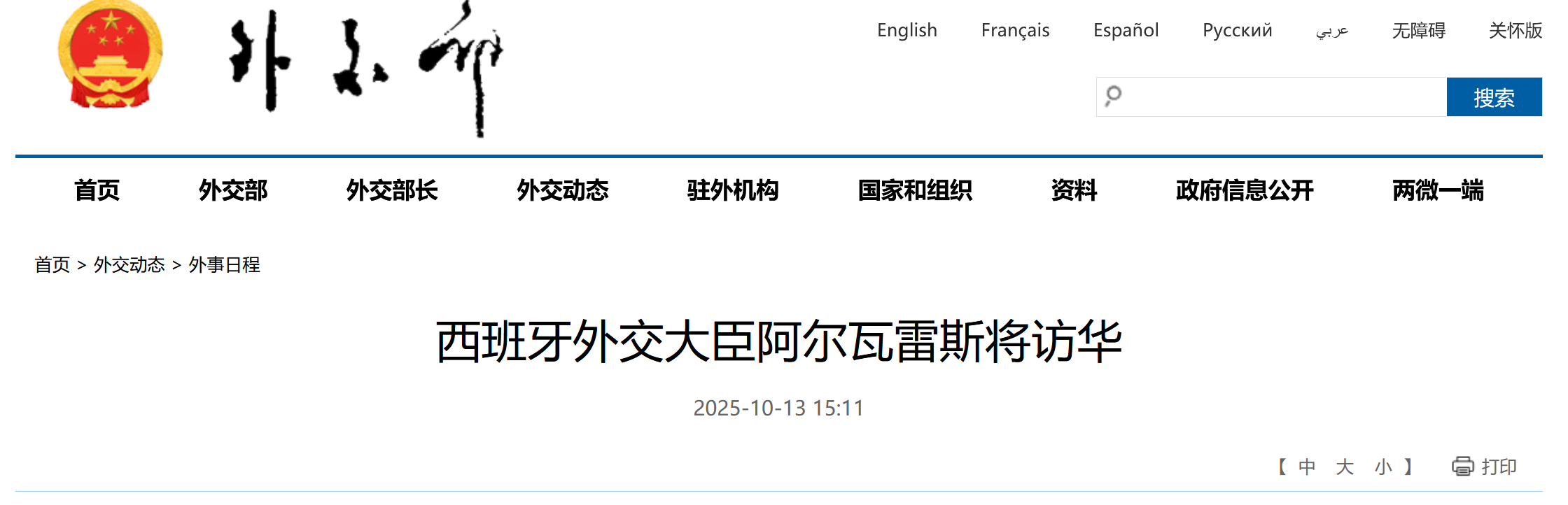 應中共中央政治局委員、外交部長王毅邀請,西班牙外交大臣阿爾瓦雷斯將於10月14日至15日對中國進行正式訪問。
