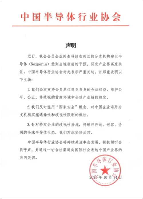 微信公眾號“中國半導體行業協會”消息,針對此前聞泰科技在荷蘭的分支機構安世半導體(Nexperia)受到當地政府幹預一事,10月14日,中國半導體行業協會發布聲明,全文如下。