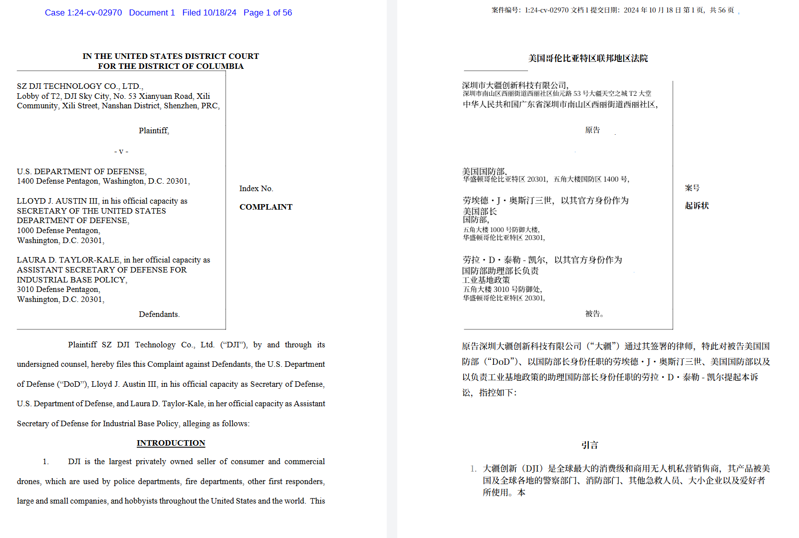 因此,2024年10月18日,大疆正式向美國哥倫比亞特區地區法院(United States District Court for the District of Columbia)提起訴訟,將美國國防部(Department of Defense, DoD)、彼時的國防部長勞埃德·奧斯汀三世以及負責工業基礎政策的助理國防部長勞拉·泰勒-卡勒告上法庭,挑戰美國國防部的決定。