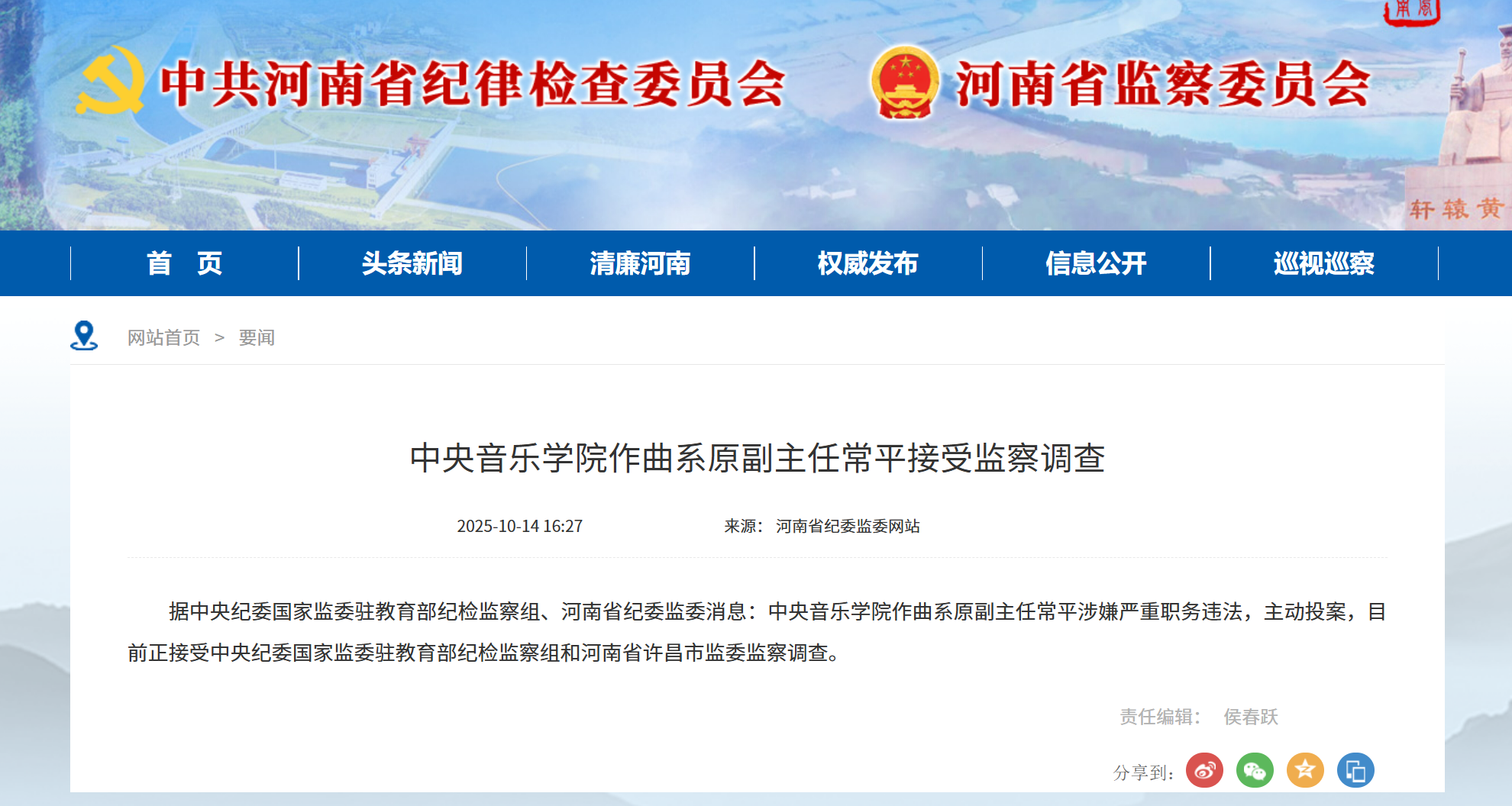 10月14日,河南省紀委監委網站通報,據中央紀委國家監委駐教育部紀檢監察組、河南省紀委監委消息:中央音樂學院作曲系原副主任常平涉嫌嚴重職務違法,主動投案,目前正接受中央紀委國家監委駐教育部紀檢監察組和河南省許昌市監委監察調查。