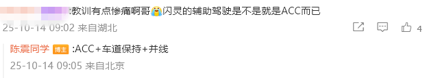 有網友詢問勞斯萊斯閃靈的輔助駕駛是否只有ACC功能,陳震表示其功能為“ACC+車道保持+併線”。他還稱,自己先前賣掉了一台庫裏南,就是因為庫裏南“太不智能了”。