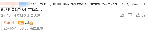 有網友稱在現行法規下輔助駕駛廠商一定會把責任推卸給駕駛人,陳震回應稱不同品牌輔助駕駛之間“區別可大了去了”,並稱“現行法規下,駕駛人不論什麼情況下都是第一責任人!比如我這次…………”。