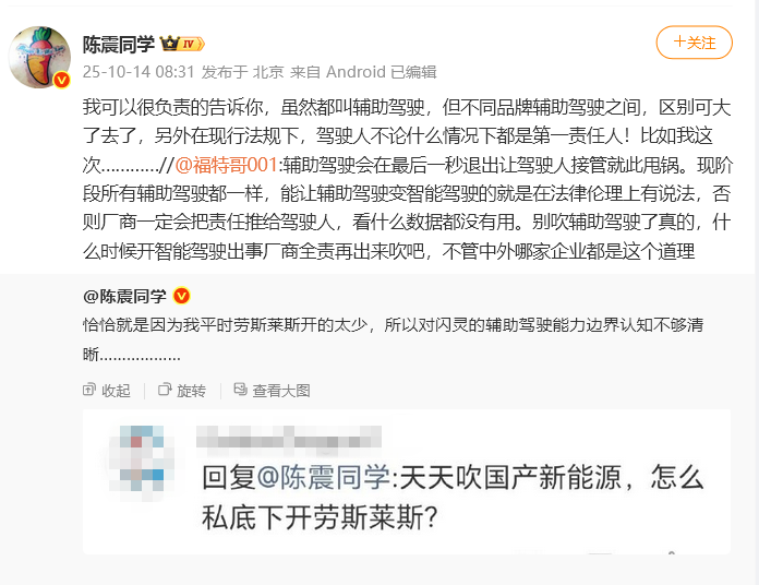 在事故發生後,有網友質疑陳震“天天吹國產新能源,怎麼私底下開勞斯萊斯”。對此陳震專門發佈微博回應稱“恰恰就是因為我平時勞斯萊斯開的太少,所以對閃靈的輔助駕駛能力邊界認知不夠清晰………………”,引發網友熱議。