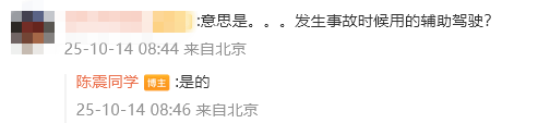 有網友在評論區詢問陳震,這是否意味着他在事故發生時使用了輔助駕駛,陳震回答稱“是的”。