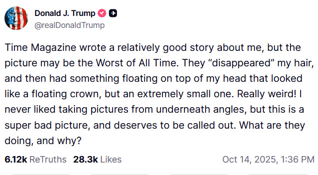 特朗普寫道:“《時代》寫了一篇關於我的還算不錯的報道,但選擇了可能是史上最差的一張照片。他們讓我的頭髮‘消失’了,然後在我頭頂上方放上了某種漂浮的東西,看起來像一頂漂浮的王冠,但卻非常小。真的很詭異!”
