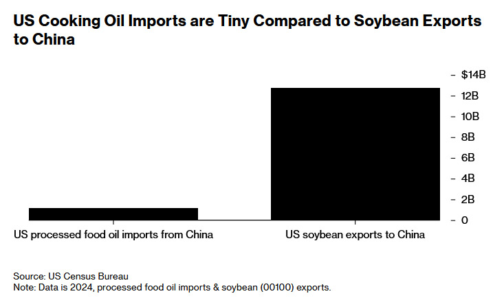 彭博社指出,與UCO相比,美國大豆貿易的價值要高得多。2024年大豆以245.8億美元的出口額位居美國農產品出口首位,佔農產品出口總額的14%。中國長期以來是美國大豆的最大買家,2024年從美國進口2213萬噸大豆,價值約126億美元。