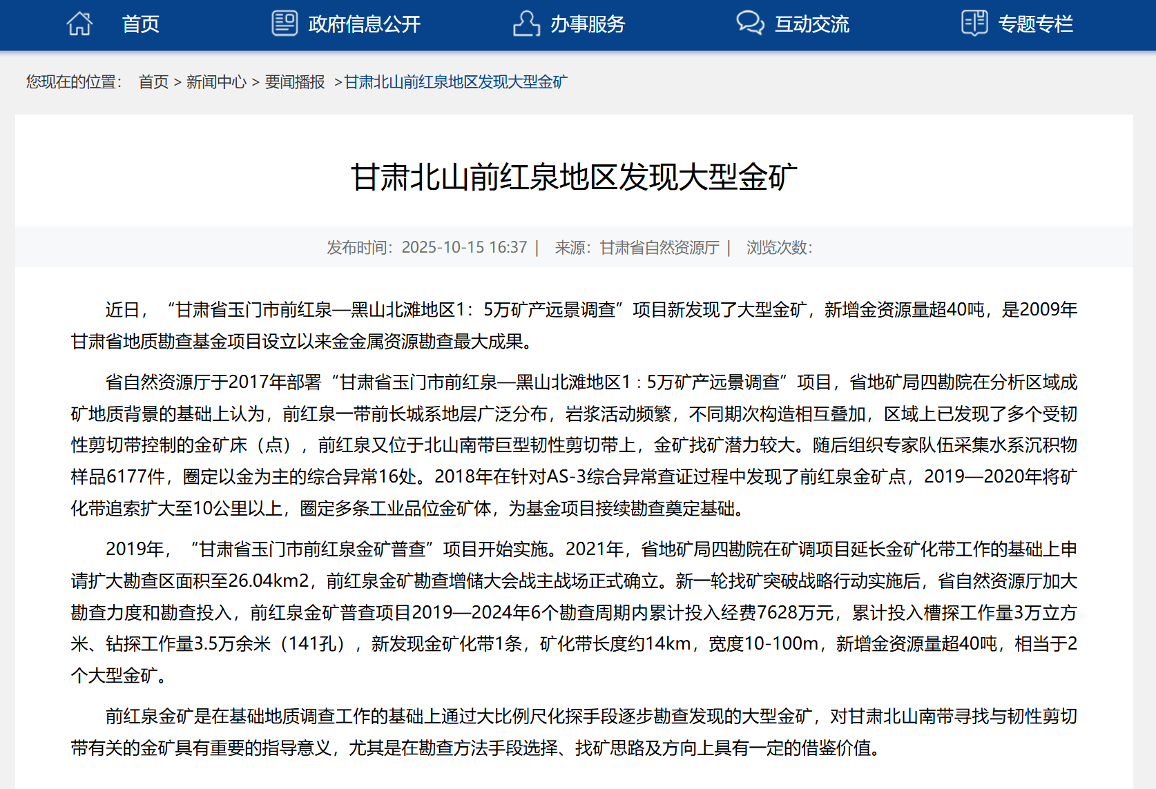 甘肅省自然資源廳網站10月15日消息,近日,“甘肅省玉門市前紅泉—黑山北灘地區1:5萬礦產遠景調查”項目新發現了大型金礦,新增金資源量超40噸,是2009年甘肅省地質勘查基金項目設立以來金金屬資源勘查最大成果。