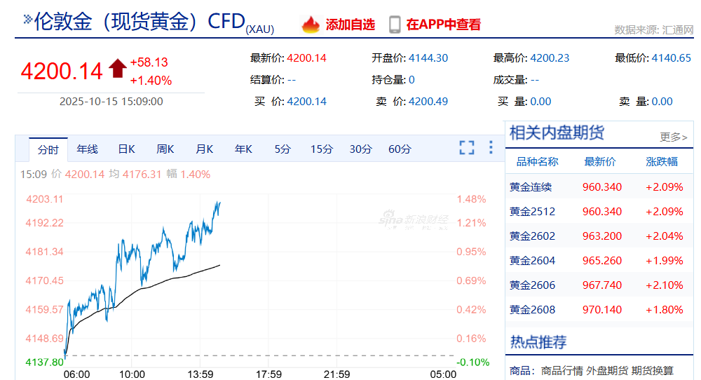 金價首破4200美元/盎司關口 guancha 2025-10-15 10月15日,截至發稿時,現貨倫敦金價格日內漲1.4%,史上首次突破4200美元/盎司關口。 本文系觀察者網獨家稿件,未經授權,不得轉載。