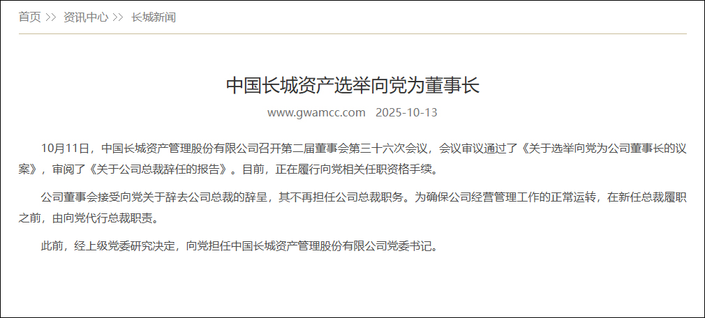 10月13日,中國長城資產管理股份有限公司(以下簡稱為“中國長城資產”)發佈公告稱,公司於10月11日召開第二屆董事會第三十六次會議,決定選舉向黨為董事長。此前,向黨已任中國長城資產黨委書記。