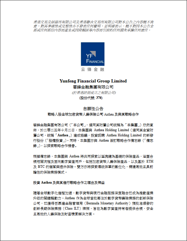 近日,港股科技金融公司雲鋒金融發佈公告稱,公司已於10月2日戰略入股全球加密貨幣人壽保險公司Anthea Holding Limited(連同旗下子公司統稱“Anthea”),並與Anthea簽署戰略合作備忘錄。
