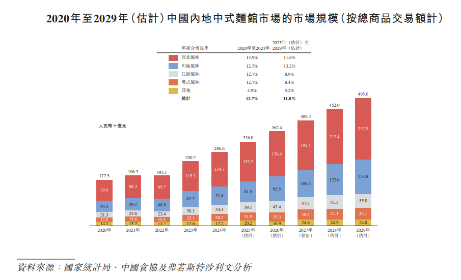 弗若斯特沙利文在相關報告中稱,中國中式麪館市場的總商品交易額由2020年的1833億元增長至2024年的2962億元,年複合增長率12.7%。而在中式麪館市場中,中國以川渝風味為主的中式麪館市場的總商品交易額從2020年的450億元擴張至2024年的727億元,年複合增長率12.8%,預期2029年的總商品交易額將達1357億元。