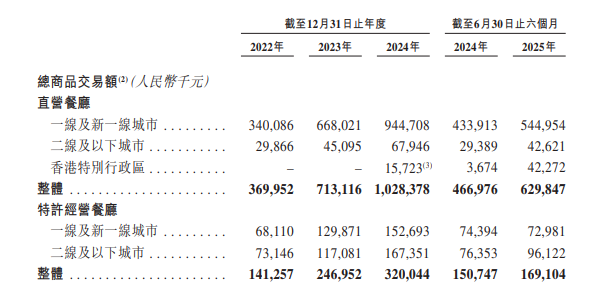 以總商品交易額來看,2022年實現5.11億元,2023年為9.60億元,2024年為13.48億元,2025年上半年達7.99億元。在2024年中國前十大中式麪館經營者中,遇見小面2022年至2024年的總商品交易額年複合增長率最高。