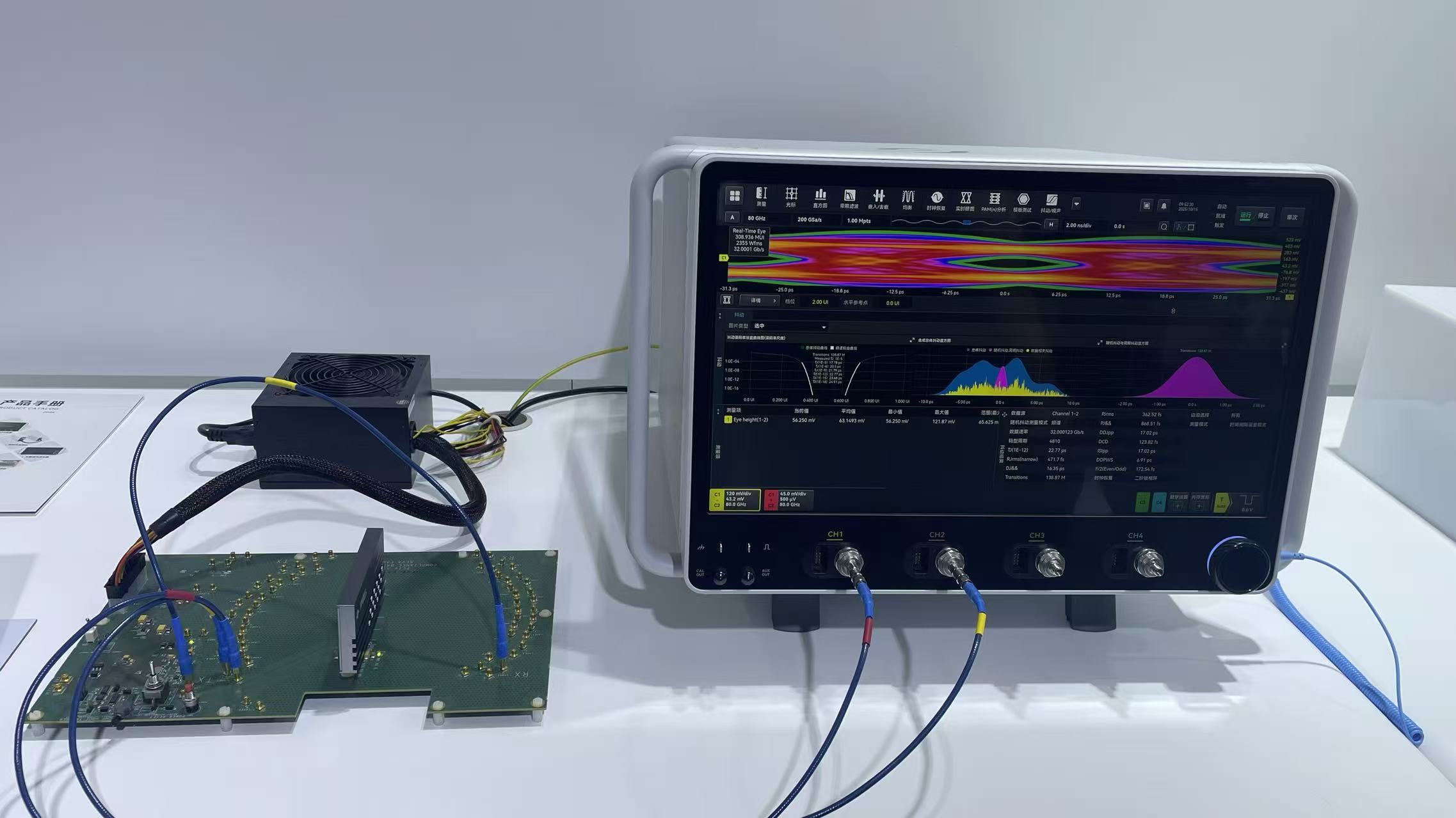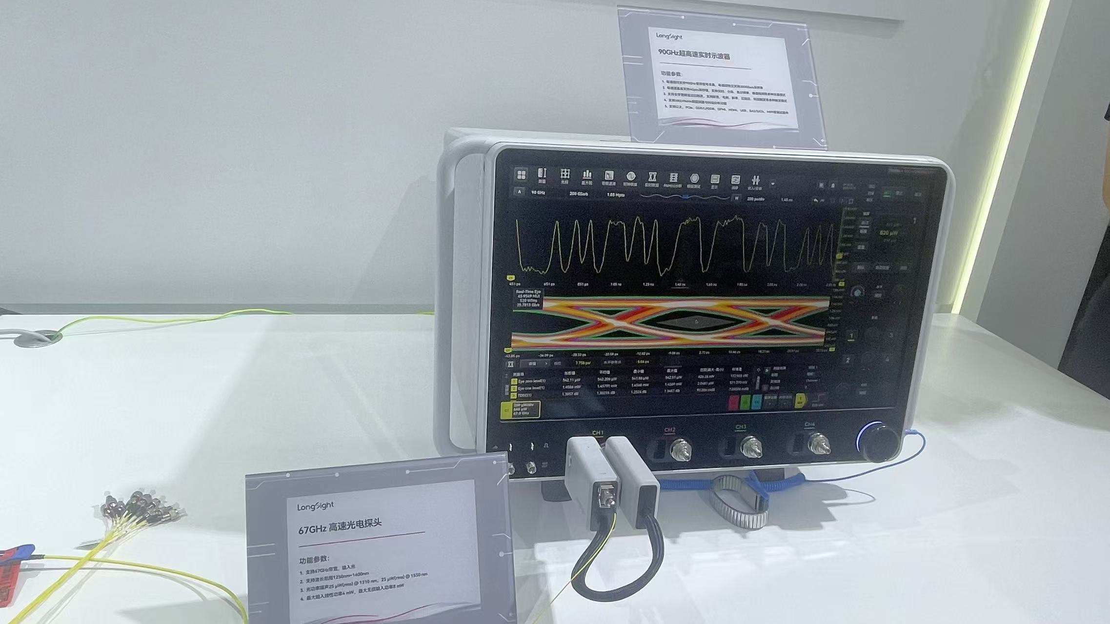 在展台現場,萬里眼展示了自主研發的新一代超高速即時示波器。這款產品的突破之處在於,每通道均支持90GHz寬帶信號採集,每通道獨立支持200GSa/s採樣率;每通道最高支持4Gpts深存儲,支持即時、分段、高分辨率、峯值檢測等多種採集模式。