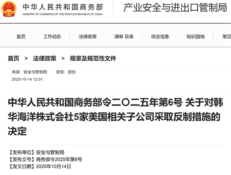 2025年10月14日,中國商務部以部長名義發佈命令,宣佈對韓華海洋株式會社5家美國相關子公司採取反制措施。
