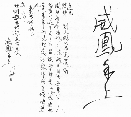 別久頗以為念,遙維闔府康泰為頌!鳳將於月內返里一行,約有一週至旬日可留,便望轉告小女及曉妹等,多年不見想念你殷,得此可增快慰也!