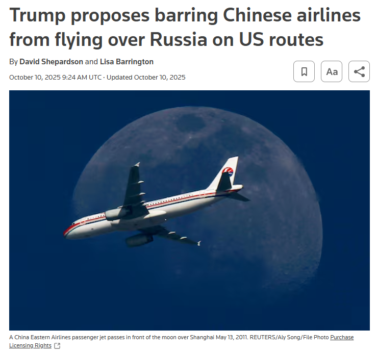 4.針對航空公司的政策:美國交通部(DOT)於10月9日提議禁止中國航空公司飛越俄羅斯領空執行中美航線航班,理由是中國航司利用俄空域獲得“非公平”優勢(如縮短飛行時間和燃料消耗)。如果該提議最終落地,禁令最快或於11月正式生效,並將迫使中國航司改道,大大增加運營成本。