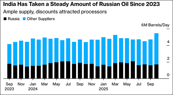 2023年9月以來,印度進口俄油量一直保持穩定。 彭博社製圖