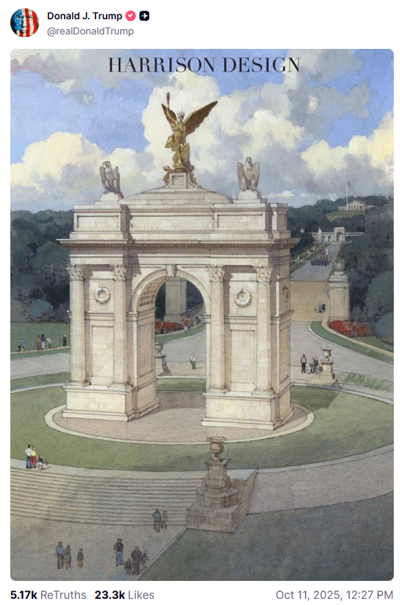 上月初,總部位於華盛頓特區的哈里森設計事務所建築師沙博諾(Nicolas Charbonneau)在社交媒體上分享了該拱門的設計圖,並寫道:“這是對‘美國250週年拱門’可能形態的深入研究”。10月11日,特朗普在真實社交平台轉發了這一設計圖。