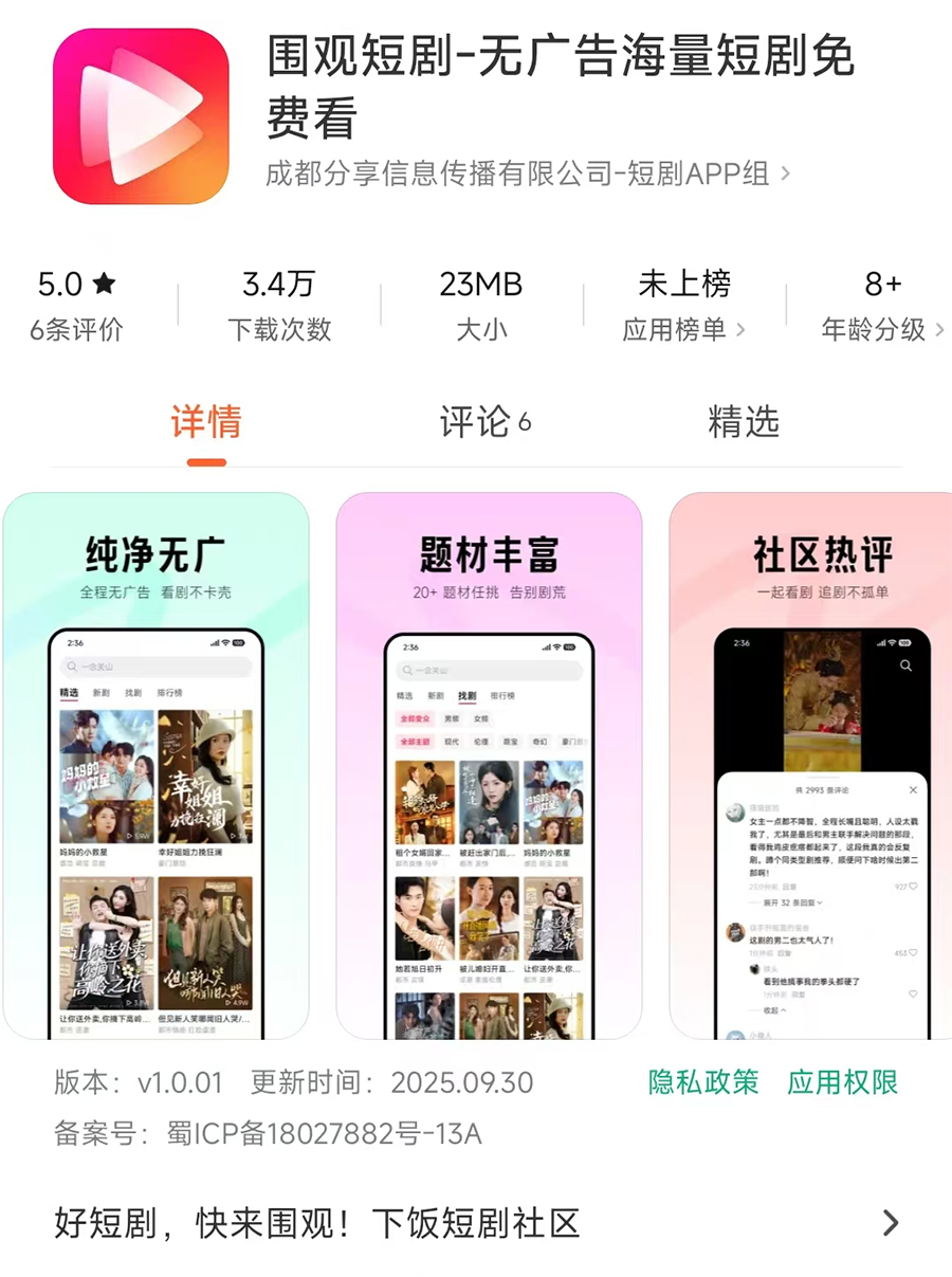 近日,小米手機在其應用商店上架了一款名為“圍觀短劇”的APP。該APP宣傳語為“無廣告海量短劇免費看”,目前下載量已達3.4萬。