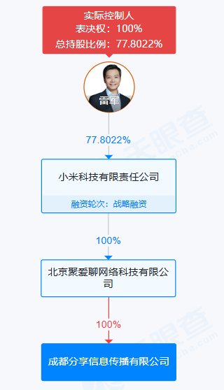 股權穿透信息顯示,該公司由北京聚愛聊網絡科技有限公司100%持股,後者則由小米科技有限責任公司全資持有。