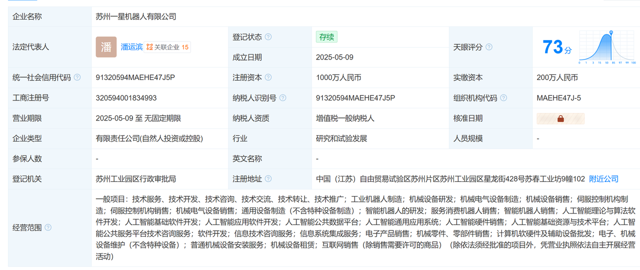 經觀察者網查找資料,一星機器人的註冊地址在蘇州工業園區星龍街,這家成立僅5個月左右的公司,目前沒有官網,在網上也難以找到公開的聯繫方式。