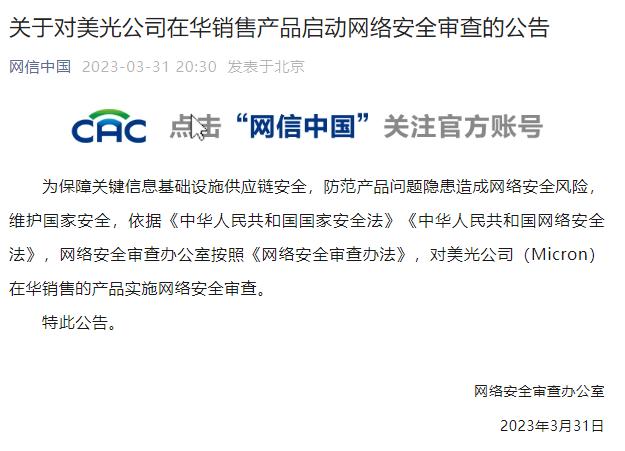 早在2023年3月,據微信公眾號“網信中國”消息,為保障關鍵信息基礎設施供應鏈安全,防範產品問題隱患造成網絡安全風險,維護國家安全,依據《中華人民共和國國家安全法》《中華人民共和國網絡安全法》,網絡安全審查辦公室按照《網絡安全審查辦法》,對美光公司(Micron)在華銷售的產品實施網絡安全審查。