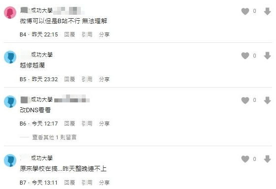 報道稱,這場“B站遭封鎖”風波,波及台灣成功大學、台灣政治大學、台灣中山大學等高校。