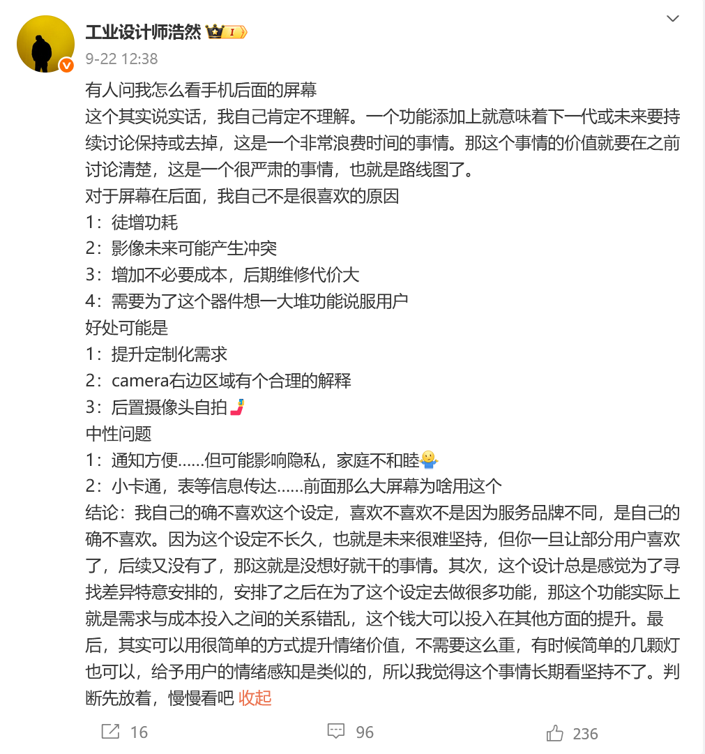 此前,OPPO工業設計中心總經理,擔任雙品牌(OPPO、一加)設計負責人的工業設計師劉浩然曾在社交平台發文稱,對於其他品牌手機增加手機背屏的設計,“自己不理解”。