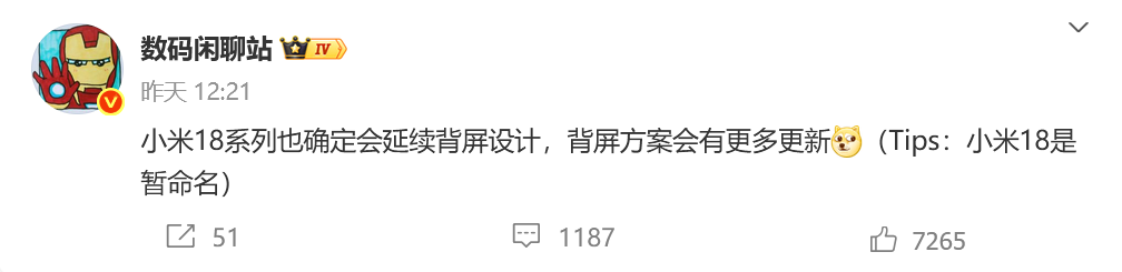 10月16日,知名博主@數碼閒聊站 爆料稱,小米下一代數字系列旗艦手機(暫命名為小米 18系列)已確定會延續背屏設計且背屏方案會有更多更新。