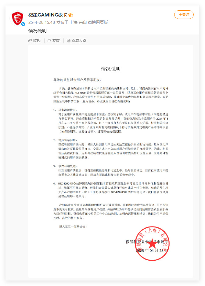 後續,微星曾通過其微博官方賬號@微星GAMING板卡 發佈情況説明回應售後問題並致歉。在這份説明中,微星解釋道,涉事用户的4090顯卡系“在某二手交易平台獲得”且無法提供購買憑據,進而影響到處理流程。