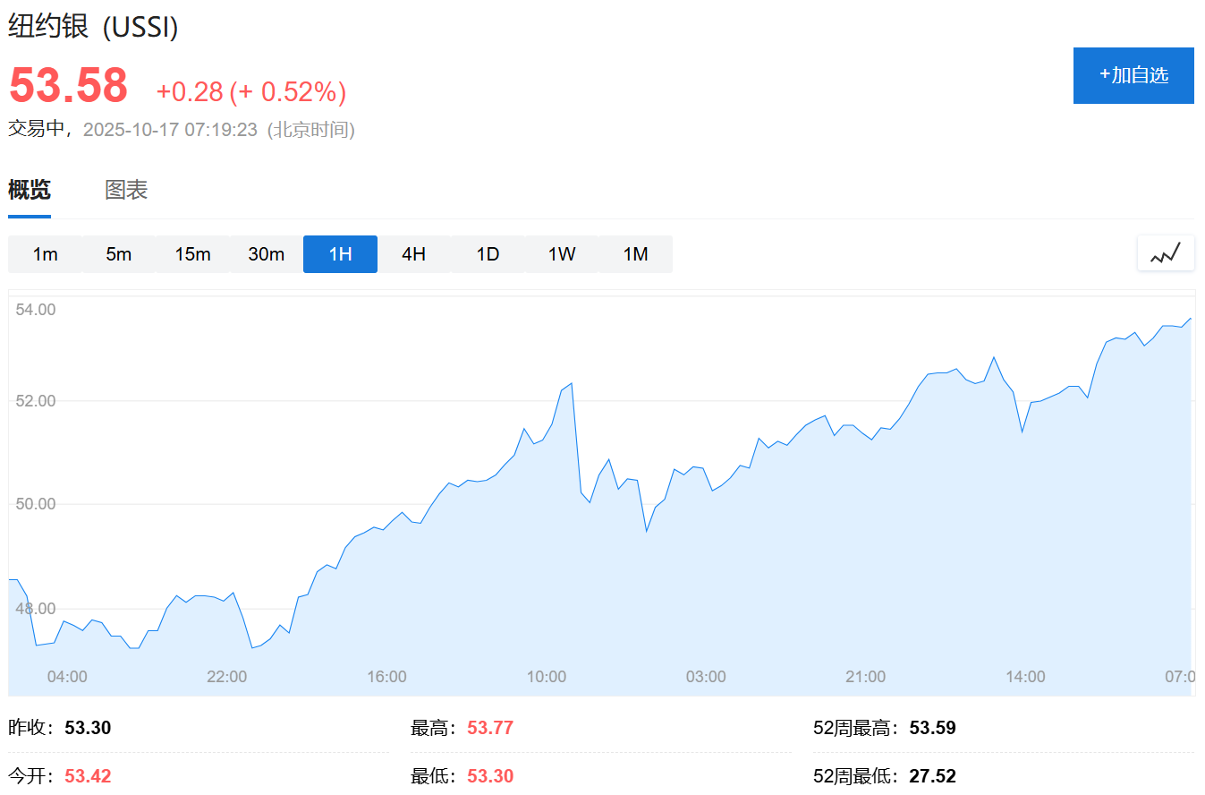 截至發稿,COMEX白銀期貨再度上漲0.52%,報53.58/盎司。
