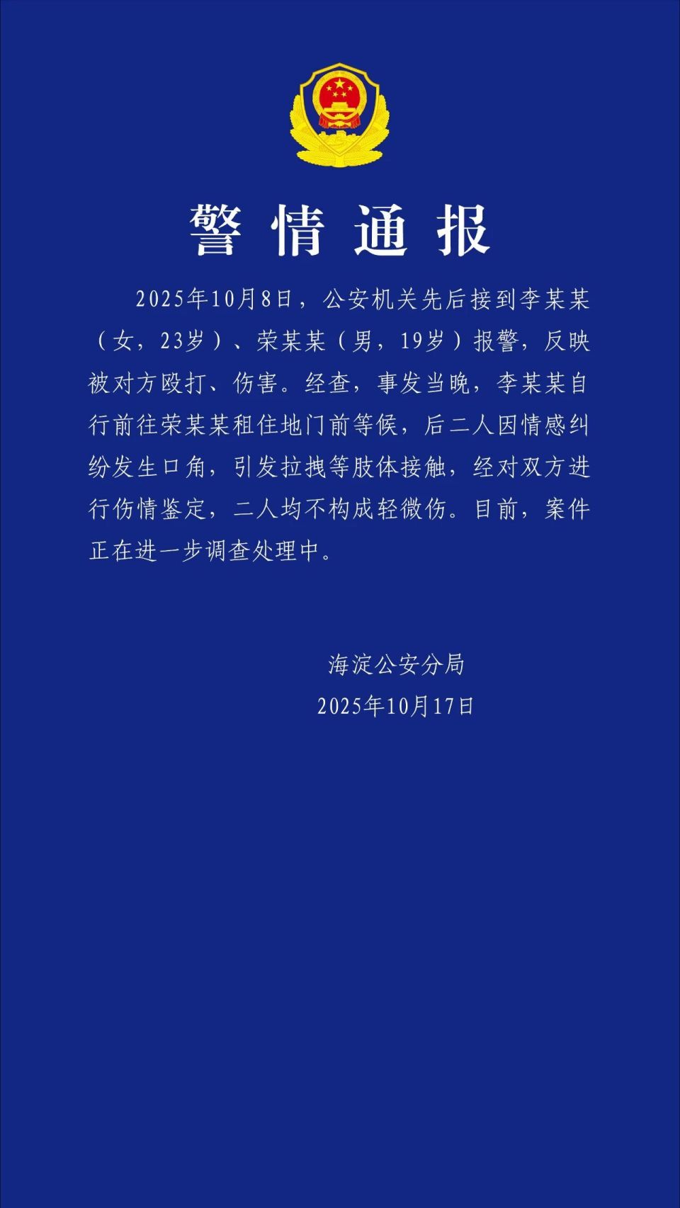 2025年10月8日,公安機關先後接到李某某(女,23歲)、榮某某(男,19歲)報警,反映被對方毆打、傷害。經查,事發當晚,李某某自行前往榮某某租住地門前等候,後二人因情感糾紛發生口角,引發拉拽等肢體接觸,經對雙方進行傷情鑑定,二人均不構成輕微傷。目前,案件正在進一步調查處理中。