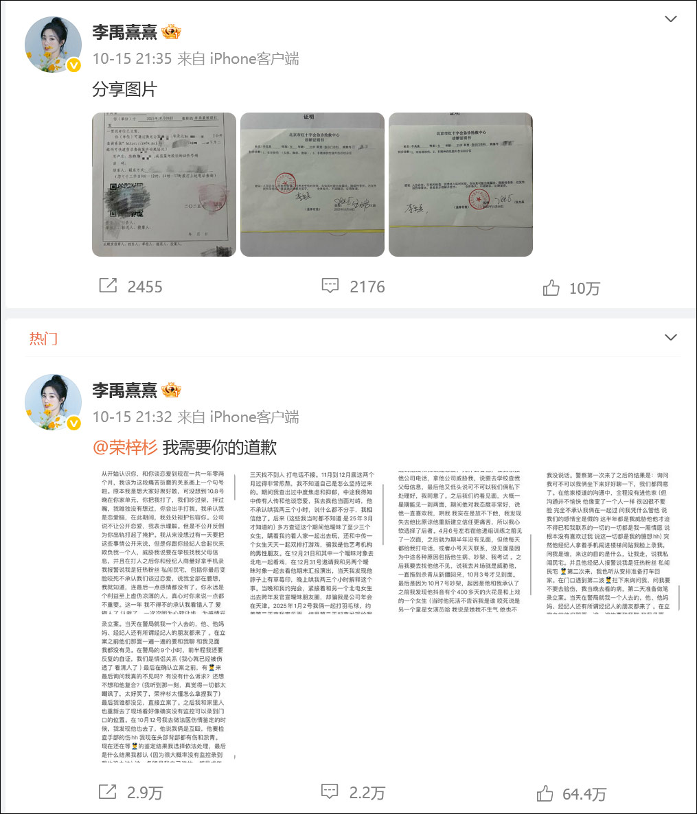 10月15日晚,演員李禹熹發佈長文指控19歲的男演員榮梓杉,稱榮梓杉在三個月戀愛期間實施冷暴力、與多名女性曖昧交往,並存在動手行為,還附上醫院出具的中度焦慮和抑鬱診斷證明,要求對方道歉。