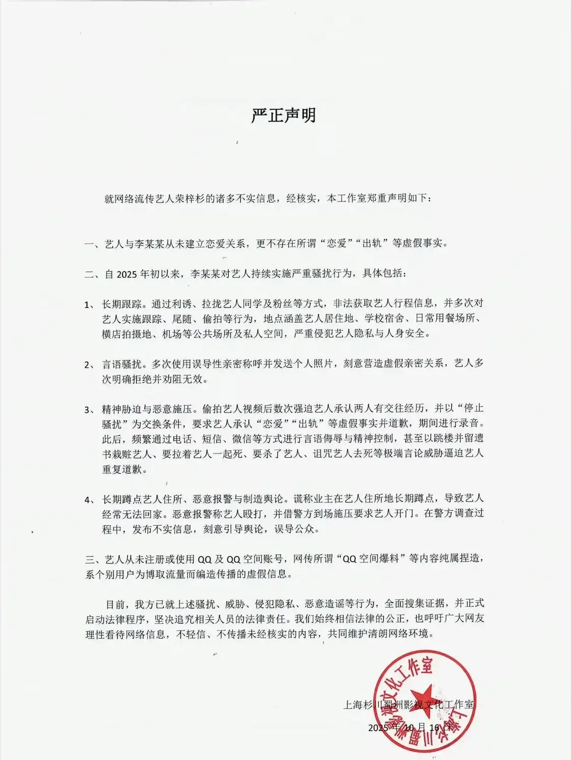 16日,榮梓杉工作室官方微博發佈嚴正聲明回應稱,藝人榮梓杉與李某某從未建立戀愛關係,更不存在“戀愛”“出軌”等虛假事實。自2025年初以來,李某某對榮梓杉持續實施長期跟蹤、言語騷擾、長期蹲點藝人住所、惡意報警與製造輿論等騷擾行為。