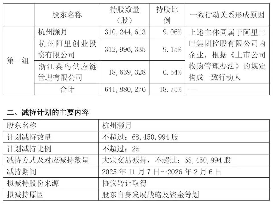 相關資料顯示,在此次減持前,杭州灝月持股9.06%,杭州阿里創業投資有限公司持股9.15%,浙江菜鳥供應鏈管理有限公司持股0.54%,一共持股為18.75%。