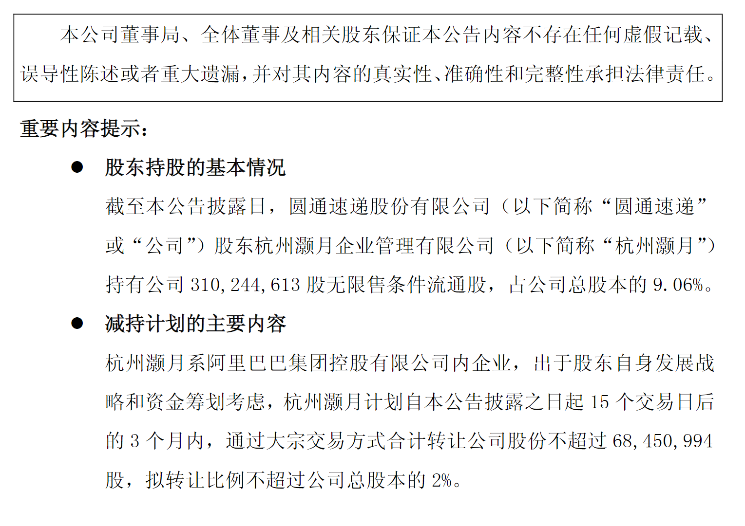 2025年6月,圓通速遞發佈公告稱,宣佈阿里旗下杭州灝月在2025年4月3日至2025年6月26日期間,通過大宗交易方式轉讓公司6893.5萬股無限售條件流通股,轉讓股份數量佔公司總股本的2%。