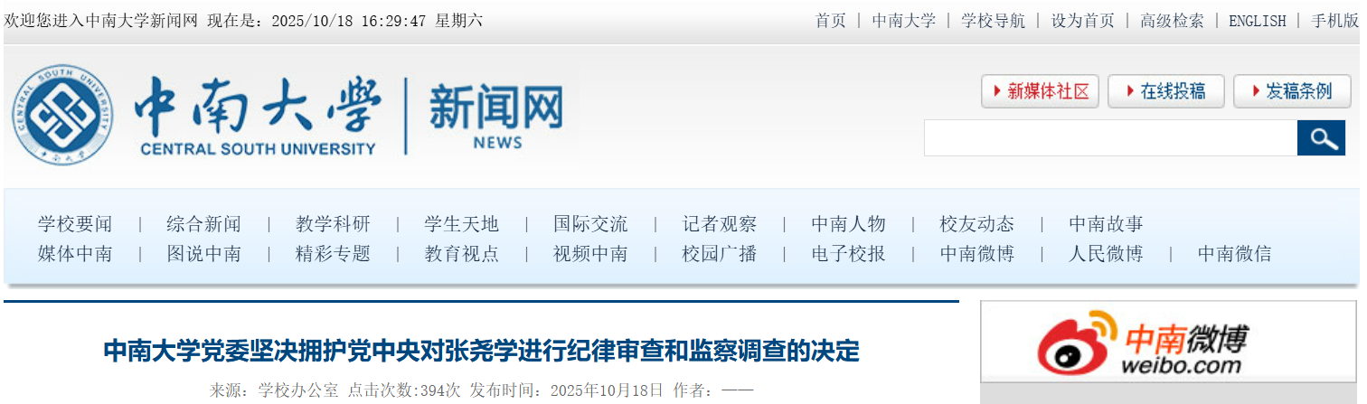 此前,10月17日,中央紀委國家監委網站通報:中南大學原黨委常委、校長張堯學涉嫌嚴重違紀違法,目前正接受中央紀委國家監委紀律審查和監察調查。