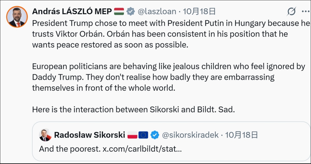 這場紛爭的起因,是歐洲對外關係委員會聯合主席卡爾·比爾特(Carl Bildt)的一番言論。他18日發帖稱,對於在布達佩斯舉辦俄美峯會,匈牙利總理歐爾班“毫無疑問”會很高興。