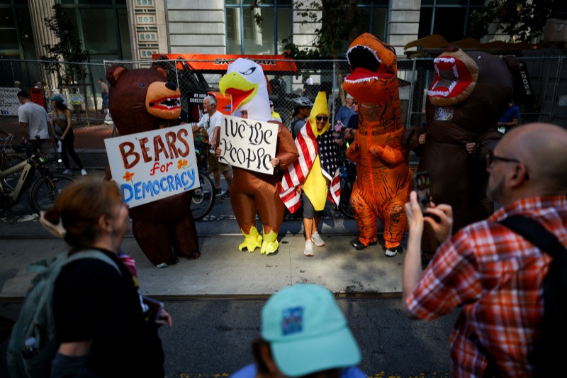 不只是青蛙,那些受到啓發的美國示威者也會把自己裝扮成恐龍或是其他卡通形象。