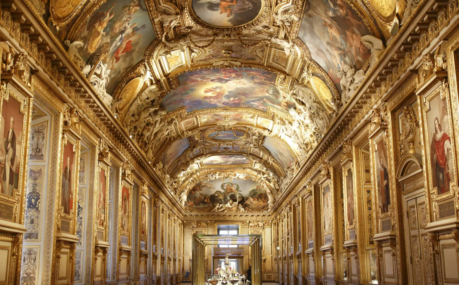 盧浮宮網站介紹,以“太陽王”自居的路易十四通過阿波羅長廊首次將王權與太陽神阿波羅聯繫在一起。路易十四召集當時最頂尖的藝術大師,以精美絕倫的繪畫、雕塑和鍍金裝飾,創作出絢麗奪目的建築內飾傑作。如今,阿波羅長廊主要展出法國宮廷的珠寶與鑽石藏品。