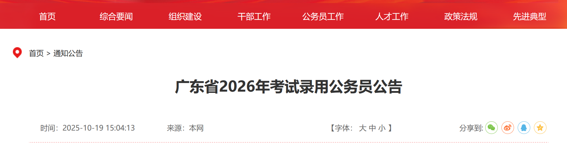 中共廣東省委組織部、廣東省人力資源和社會保障廳於10月19日發佈廣東省2026年考試錄用公務員公告:
