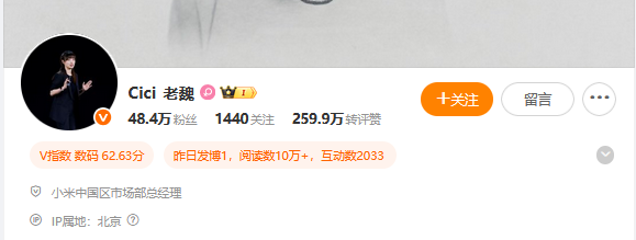 同時,魏思琪的社交媒體賬號認證信息也已更改為“小米中國區市場部總經理”,此前為“小米手機市場部總經理、小米汽車市場部副總經理”。