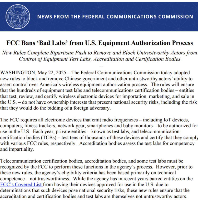 從5月提案到9月執行,FCC給了中國實驗室四個月的緩衝期。但這種“温和”是虛偽的,四個月的時間,既不足以讓企業完成認證渠道的調整,也不足以讓實驗室通過股權重組來規避新規。相反,這段時間更像是一個觀察期,讓FCC確認哪些實驗室會嘗試規避、哪些實驗室會直接放棄,從而為下一步的精準打擊提供情報。