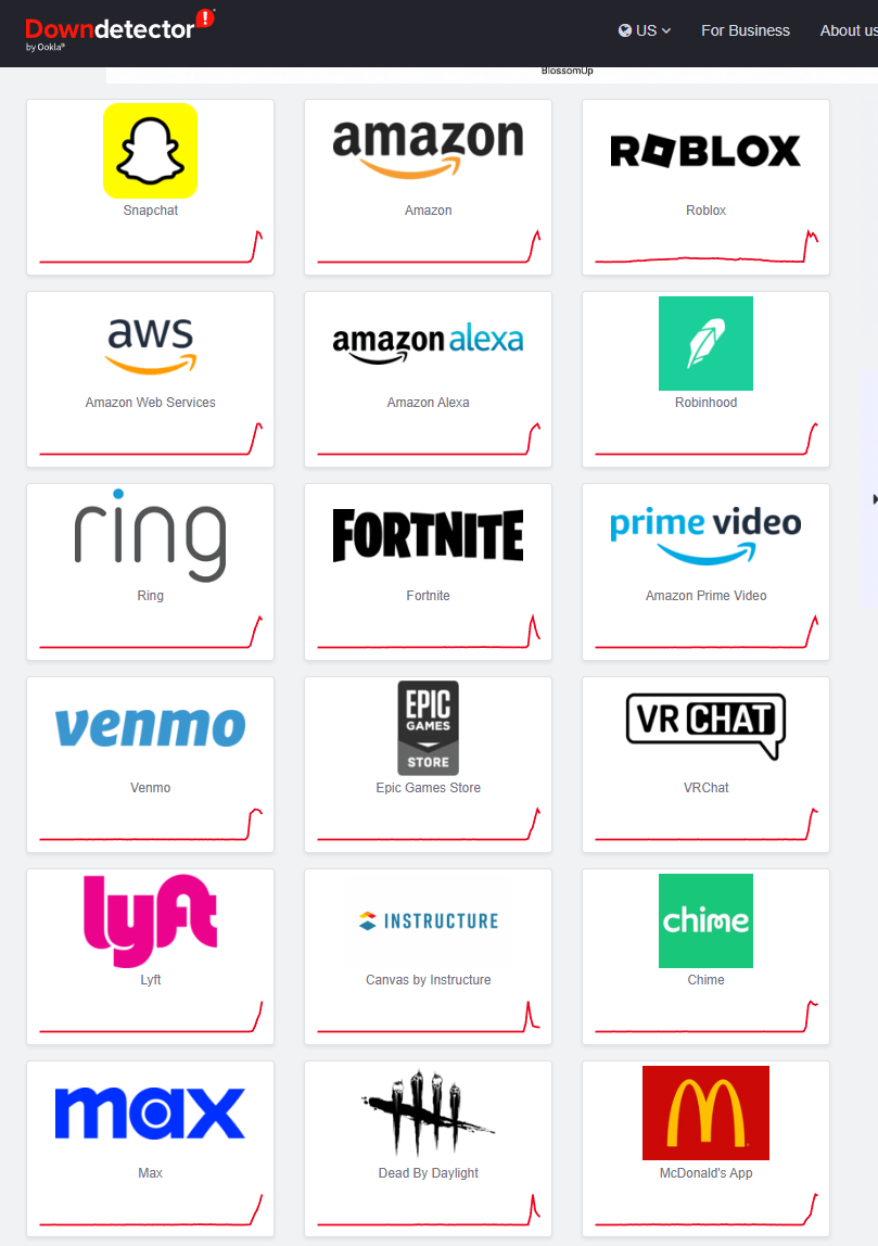 具體來看,報告顯示,成百上千家美國網站和應用都受到這次事件的衝擊,已確認出現故障的主要平台和服務包括:亞馬遜自家的網站;金融與流媒體服務:Robinhood、Coinbase 、PayPal旗下Venmo、Chime、迪士尼+、Apple TV;社交媒體:Snapchat、Reddit;遊戲:Roblox、堡壘之夜、Steam、PlayStation Network、Xbox、育碧;以及麥當勞、《華爾街日報》、Perplexity、多鄰國等。