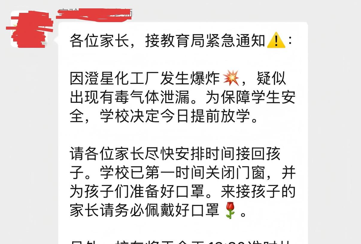 不過在此之前,有疑似當地學校老師在微信羣告知家長,接教育局緊急通知,因澄星化工廠發生爆炸,疑似出現有毒氣體泄漏。為保障學生安全,學校決定今日提前放學。學校已第一時間關閉門窗,併為孩子們準備好口罩,請家長儘快安排時間接回孩子。並提醒家長,務必佩戴好口罩。