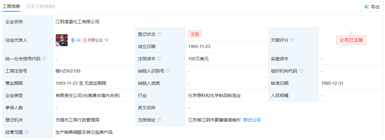 天眼查顯示,江陰澄星化工有限公司成立於1993年11月23日,位於江陰市要塞鎮澄南村,是一家以從事化學原料和化學制品製造業為主的企業。企業註冊資本108萬美元,經營範圍:生產銷售磷酸及其它鹽類產品。