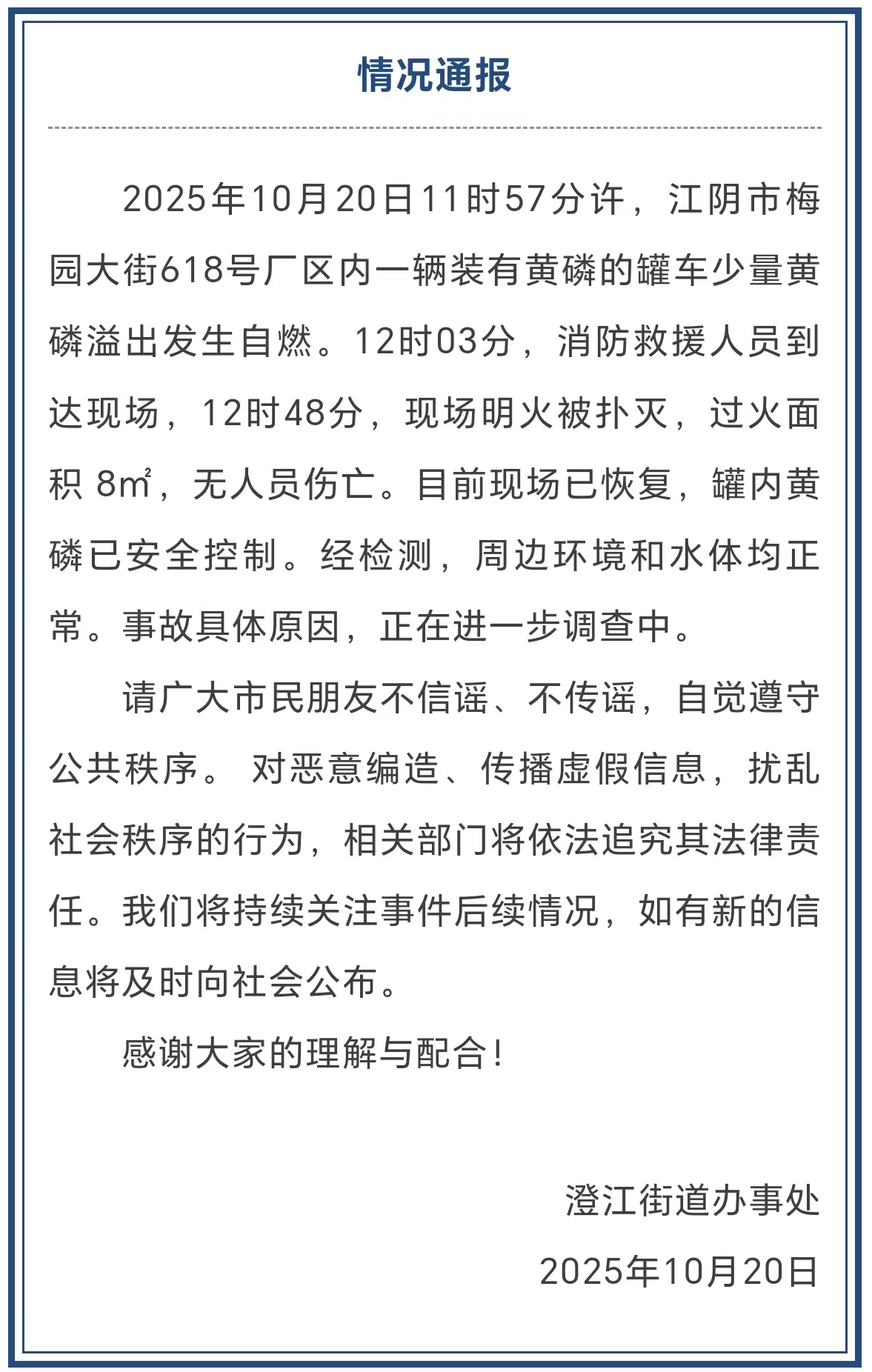 當日晚間,“澄江發佈”官方微信公眾號發佈“情況通報”顯示,2025年10月20日11時57分許,江陰市梅園大街618號廠區內一輛裝有黃磷的罐車少量黃磷溢出發生自燃。12時03分,消防救援人員到達現場,12時48分,現場明火被撲滅,過火面積 8㎡,無人員傷亡。目前現場已恢復,罐內黃磷已安全控制。經檢測,周邊環境和水體均正常。事故具體原因,正在進一步調查中。