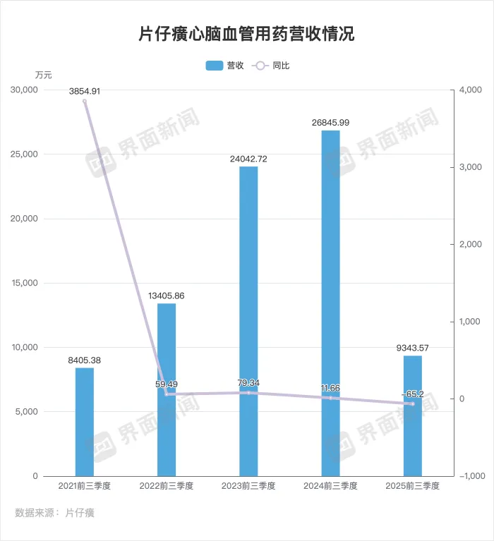 據片仔癀2025年前三季度主要經營數據公告,心腦血管用藥實現營收9343.57萬元,同比下降65.2%。